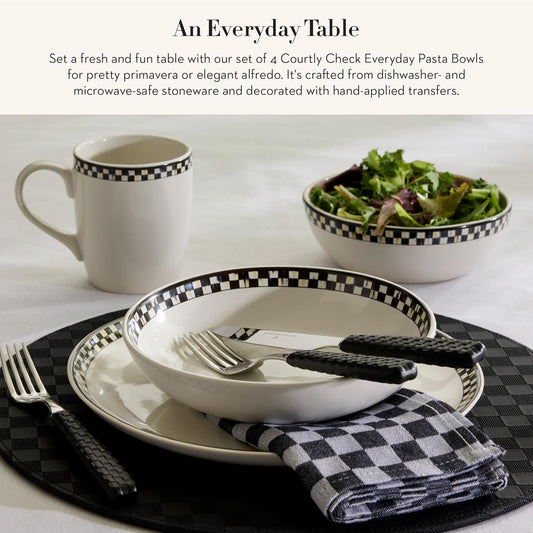 MACKENZIE-CHILDS Set of 4 Everyday Pasta Bowls, Microwave-Safe and Dishwasher-Safe Stoneware Bowls, Black-and-White Courtly Check