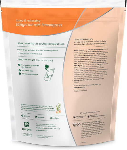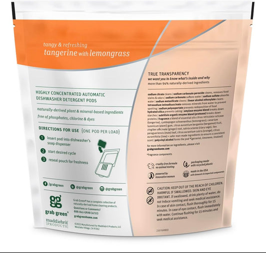 Grab Green Automatic Dishwashing Detergent Pods, 60 Count, Tangerine Lemongrass Scent, Plant and Mineral Based, Superior Cleaning, Powerful Grease Removal, Brilliant Shine