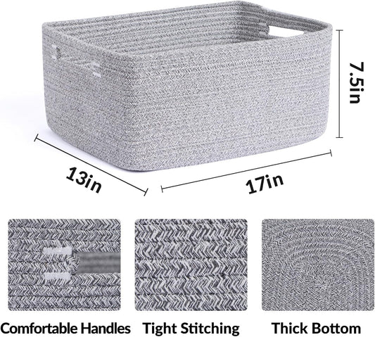Large Storage Baskets for Shelves, Closet Organizers Bins for Clothes Blanket Towels, Baby Nursery, Toy Baskets Box, Woven Rope Baskets, 17 x 13 x 7.5”, 3 Packs Mixed Grey