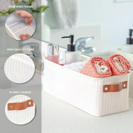 OrganiHaus Narrow Storage Bins 15x06in, Small Closet Bins for Shelves, Bathroom Storage Baskets, Narrow Baskets, Fabric Organizer with Handles, Toilet Paper Organizer - 2 Pack, White w/Brown Stripes
