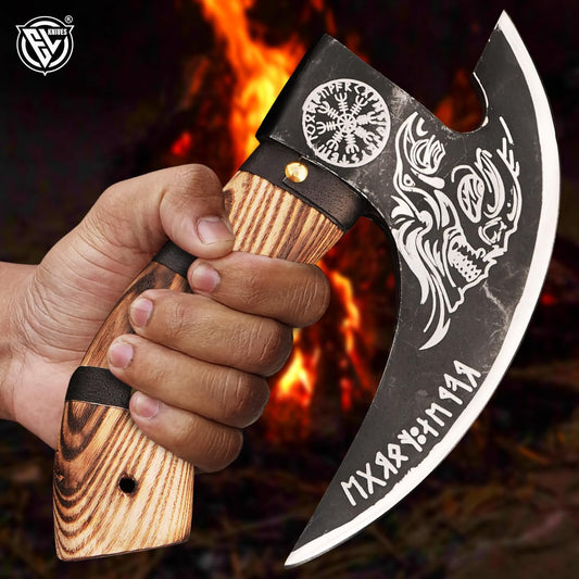 Edgelandknives® Multipurpose Viking Pizza Axe with Sheath, Viking Butcher Axe, Viking Pizza Cutter Axe - Burned Wood Handle & Heavy Duty Viking Skull Head - Perfect for Cutting Pizza, Meat, Vegetables
