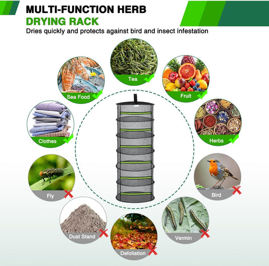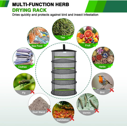 Yesker 6 Layer Herb Drying Rack Hanging Mesh Net Foldable Plant Drying Racks 24" Diameter with Green Zipper & Hook Dryer Hanging Rack for Herbs Seed Bud Fruit Clothes Grow Tent Closets Garden Outdoor