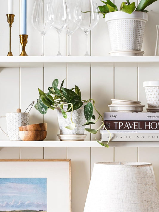 LE TAUCI Ceramic Plant Pots, 6 Inch Flower Pot with Drainage Hole & Saucer, Embossed Planter Pots for Indoor Plant Succulent, Orchid, Cactus, Home Decor - Set of 4, Arctic White