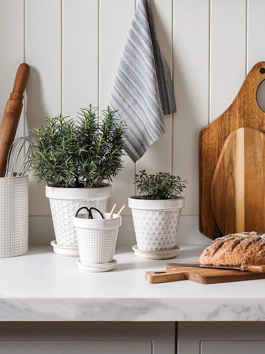 MACKENZIE-CHILDS Enamel Herb Pots, Small Plant Pots for Herbs or Flowers, Set of 3, Gray-and-White Sterling Check