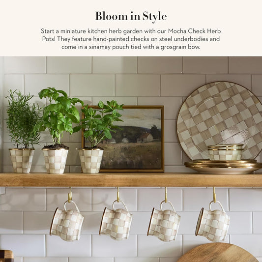 MACKENZIE-CHILDS Enamel Herb Pots, Small Plant Pots for Herbs or Flowers, Set of 3, Brown-and-White Mocha Check
