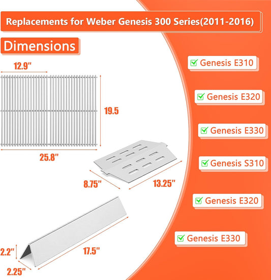 Grill Parts for Weber Genesis 300 Series, 19.5”Grill Grates & Flavorizer Bars, Heat Deflector for Weber E/S310, 320, 330 with Front Control Knobs, Replacement for Weber 7528, 7524, 7620, 7622, 65505