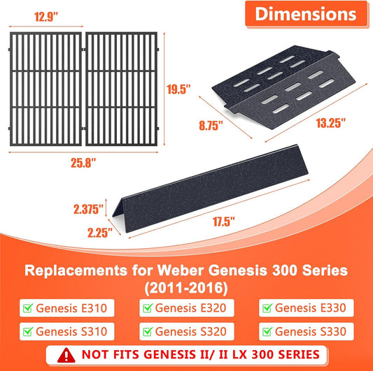 Genesis Grill Parts for Weber Genesis 300 Grills with Front Control Knob, Genesis E310 S310 E/S320 E/S330, Grill Grates 7524 7528, Flavorizer Bars & Heat Deflectors for Weber 7621 7620 65505