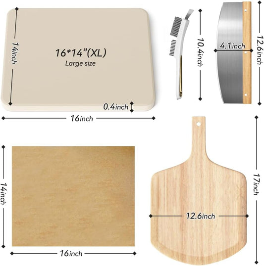5 PCS Rectangle Pizza Stone Set, 16"Large Pizza Stone for Oven and Grill with Pizza Peel(OAK), Pizza Stone Brush,Pizza Cutter & 10pcs Cooking Paper for Free, Baking Stone for Pizza, Bread,BBQ