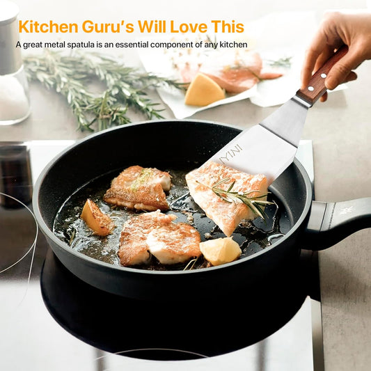 Stainless Steel Spatula Turner for Cast Iron Skillet, Grill Spatula with Wooden Handle, Heavy Duty Pancake Turner Metal