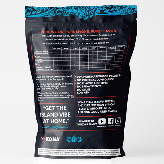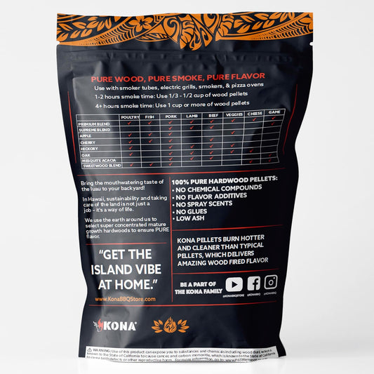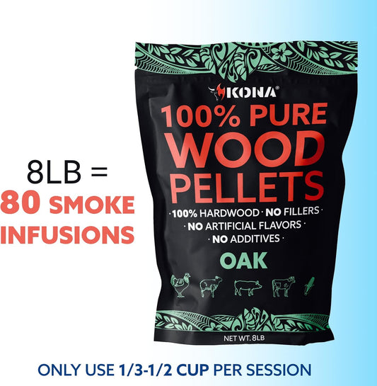 Kona Premium BBQ Wood Pellets Offer high BTU, Clean-Burning, Low-ash, and Low-Moisture for Great Flavor. No Soaking Needed. Includes 8 Varieties. Use 1/3-1/2 Cup per Session for Hours of Smoking.