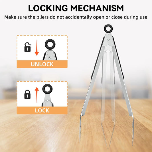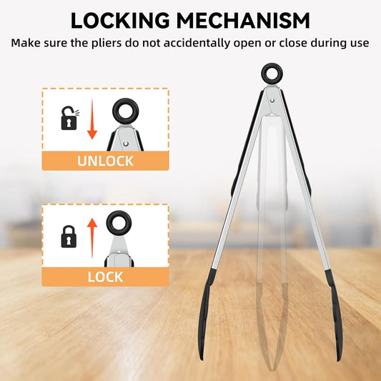 NileHome Tongs for Cooking, Professional Stainless Steel Cooking Tongs – Heat-Resistant for Grilling, BBQ, Serving Salad, Pasta, and Kitchen Use, Dishwasher Safe, Set of 7" 9" 12", Black