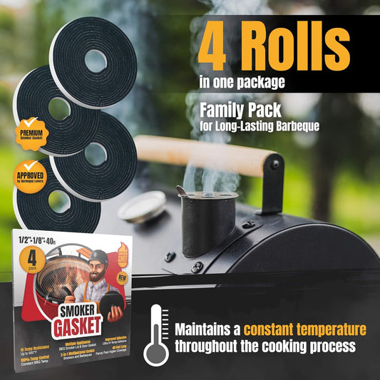 XXL 40 FT Grill Gasket for Smokers - Black 1/2’’ x 1/8’’ Hi Temp Seal Smoker Gasket – 4-Pack x 10 FT Self Stick Black Nomex Fire Tape BBQ Lid – Bbq Grill Smoker Accessories Gifts for Men