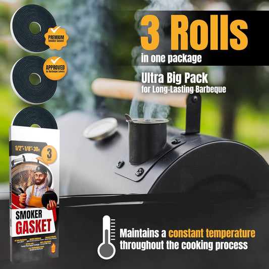 XXL 30 FT Grill Gasket for Smokers - Black 1/2’’ x 1/8’’ Hi Temp Seal Smoker Gasket – 3-Pack x 10 FT Self Stick Black Nomex Fire Tape for BBQ Lid – High Heat Temperature Material Replace