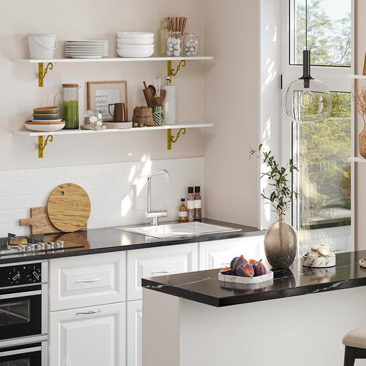 DINZI LVJ Long Wall Shelves, 47.3" Wall Mounted Shelves Set of 4, Wide Floating Shelf with Metal Brackets, for Living Room, Bathroom, Bedroom, Kitchen, Office, White and Gold
