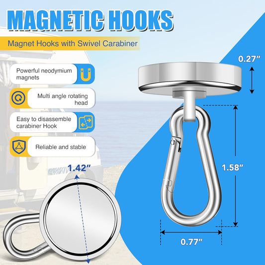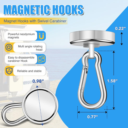 Magnetic Hooks, 70Lbs Heavy Duty Magnetic Hooks with Swivel Carabiner for Cruise Cabins, 6 Pack Extral Strong Neodymium Magnet Hooks for Hanging, Metal Magnetic Hanger for Toolbox, Grill, Fridge