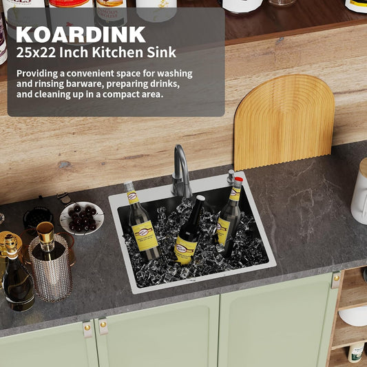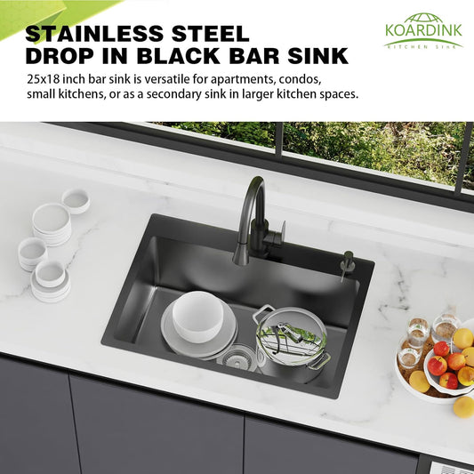 Black 25x18 Inch Kitchen And Bar Sink - Stainless Steel Drop In Single Bowl Topmount Modern Kitchen And Bar Sink With Spoon Rest,Drain Strainer Set Compatibility With Various Kitchen&Bar Style