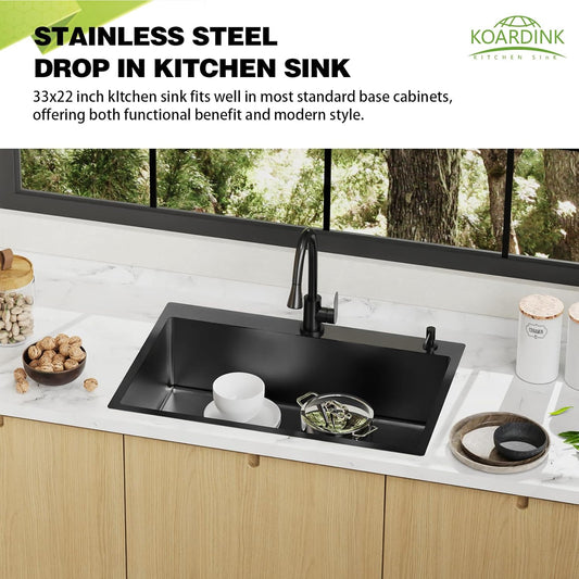 Black 33x22 Inch Stainless Steel Kitchen Sink - Drop In Modern Single Bowl Topmount Kitchen Sink With Silicon Mat,Drain Strainer Set Offering Large Basin Compatibility With Various Kitchen&Bar Style
