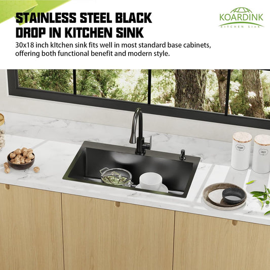 Black 30x18 In Drop In Kitchen Sink-Stainless Steel Topmount Modern Single Bowl Kitchen Sink Come With Silicon Mat,Drain Strainer Set Offer Large Basin And Compatibility With Various Kitchen&Bar Style