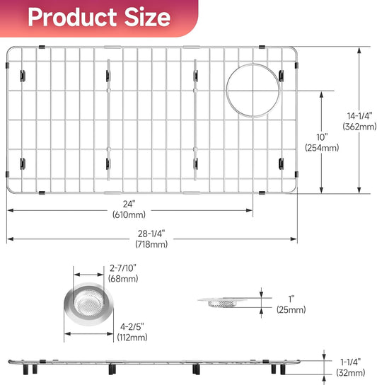 28-1/4" x 14-1/4" x 1-1/4" Stainless Steel Sink Rack for Bottom of Sink, Metal Sink Protectors For Kitchen Sink, Sink Grid, Sink Bottom Grid with Side Drain, Kitchen Sink Grid with Sink Strainer