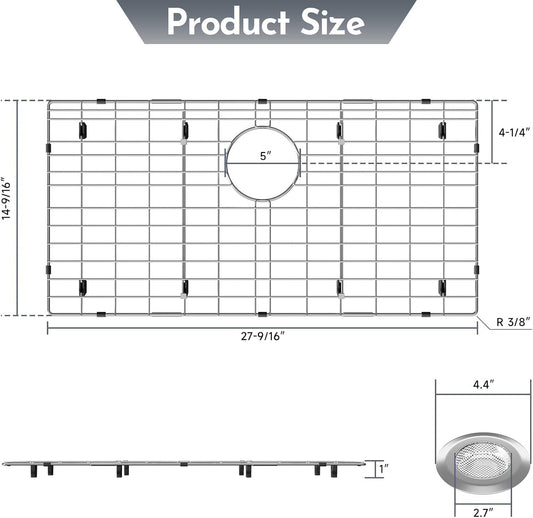 27-9/16" x 14-9/16" Stainless Steel Sink Protector, Sink Protectors for Kitchen Sink, Sink Grid, Sink Grate for Bottom with Rear Drain, Metal Sink Rack for Bottom of Sink with Corner Radius 3/16"