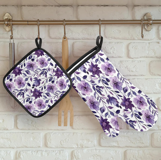 Flower Oven Mitts and Pot Holders Sets, 2 Pcs Purple Floral Decorative Kitchen Oven Glove for Cooking