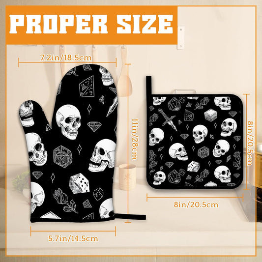 Skull Head Oven Mitts and Pot Holders, Rose Heat Resistant Oven Mitts Gloves and Pot Holder for Home Kitchen Decorations Cooking Baking BBQ Gifts,Set of 4