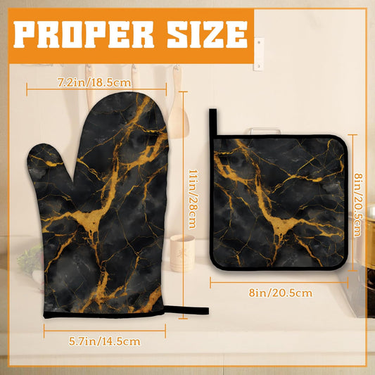 Marble Oven Mitts and Pot Holders Set,Black Gold Marble Kitchen Decor Heat Resistant Non Slip Hot Pads and Oven Mitt for Chef Cooking Baking BBQ Mom Girl Gifts(4 Piece Set)