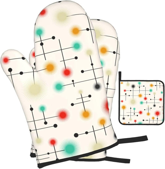 Mid Century Modern Oven Mitts and Pot Holders Sets of 3 Heat Resistant Non Slip Retro Kitchen Gloves Hot Pads for Cooking BBQ Grilling Baking