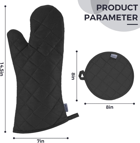 Set of 4 Oven Mitts and Pot Holder Heavy and Tall Kitchen Cotton Gloves Lined Towelcloth, Gloves Length 40cm, Pot Holder Width 20cm Diameter Round… (Black)