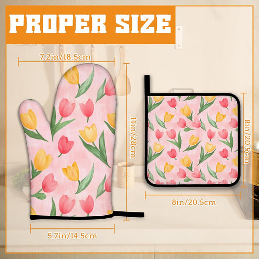 Pink Tulip Oven Mitts and Pot Holders Set,Spring Summer Kitchen Decor Heat Resistant Non Slip Hot Pads and Oven Mitt for Chef Cooking Baking BBQ Mom Girl Gifts(4 Piece Set)