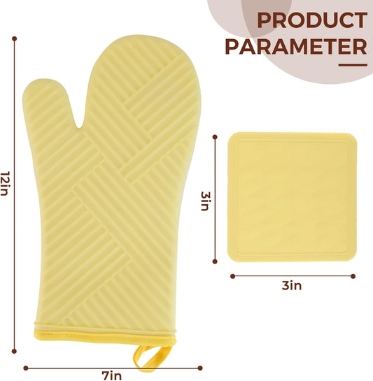 Set of 4 Oven Mitts and Pot Holder Heavy and Tall Kitchen Cotton Gloves Lined Towelcloth, Gloves Length 40cm, Pot Holder Width 20cm Diameter Round… (Yellow Silicone)