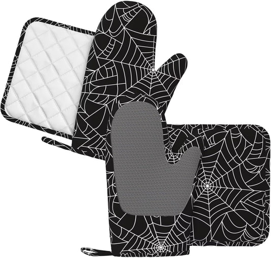 Black and White Spider Web Oven Mitts and Pot Holders Set of 4 Silicone Spiderwebs Kitchen Mitten Gloves and Non-Slip Potholders Set Heat Resistant Oven Gloves Hot Holders for Kitchen