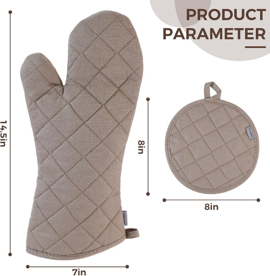 Set of 4 Oven Mitts and Pot Holder Heavy and Tall Kitchen Cotton Gloves Lined Towelcloth, Gloves Length 40cm, Pot Holder Width 20cm Diameter Round… (Light Brown)