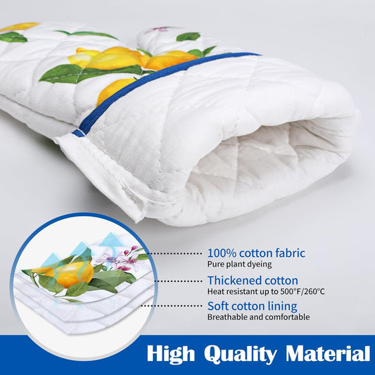 Summer Lemon Oven Mitts and Pot Holders Sets 2Pcs, 100% Cotton Heat Resistant, Extra Long Oven Gloves Potholder for Kitchen Cooking Baking Decoration