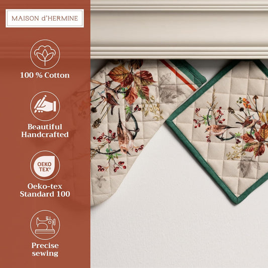 Bird Branch Oven Mitts and Pot Holders Sets 2Pcs, 100% Cotton Heat Resistant, Extra Long Oven Gloves Potholder for Kitchen Cooking Baking Decoration