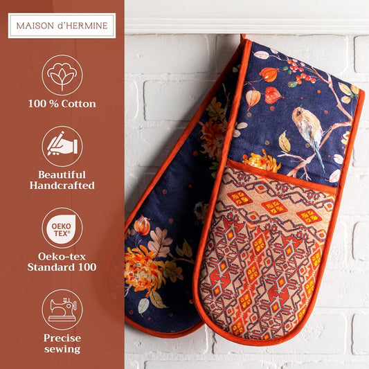 Maison d' Hermine Double Oven Mitts 100% Cotton 7"x35" Double Oven Mitt Heat Resistant BBQ Cooking Gloves with Loop, Baking, Grilling, Home, Kitchen, Handling Hot Pans (Colors of Autumn)