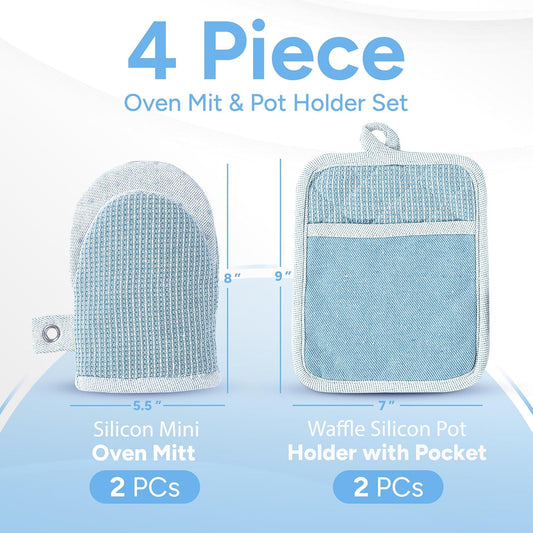 Casa Platino BBQ Gloves & Potholders Set, 4Pc Kitchen Mitts for Oven & Baking, Pot Holder for Hot Pots & Dishes – Heat Resistant Up to 500°F, Non-Slip & Machine Washable – Cornflower