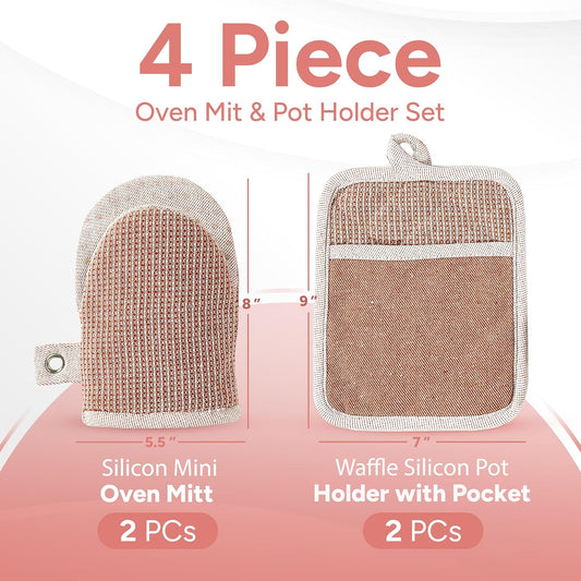Casa Platino Cute Oven Mitts & Pot Holders, 4-Piece – Oven Mitts Heat Resistant for Grilling & Baking, Pot Holder for Hot Cookware & Microwave – Withstands Up to 500°F, Non-Slip – Canyon Rose