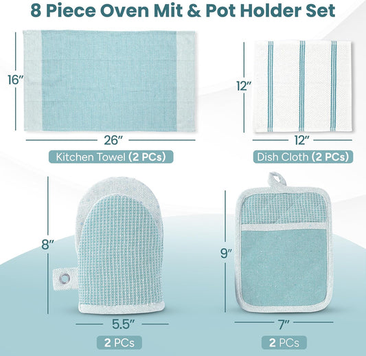 Casa Platino Oven Mitts and Pot Holders Sets, 8-Piece – 500°F Heat Resistant Mini Oven Mitts with Silicone Grip, Potholders for Kitchens, 2 Kitchen Towels & 2 Dish Cloths – Non-Slip & Durable – Aqua