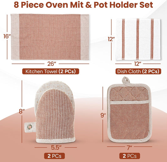 Casa Platino Potholders for Kitchens, 8-Piece – 500°F Heat Resistant Oven Mitts and Pot Holders, Mini Oven Mitts with Silicone Grip, 2 Kitchen Towels & 2 Dish Cloths – Durable & Non-Slip – Canyon Rose