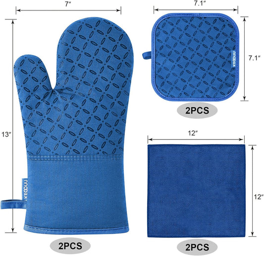 KEGOUU Oven Mitts and Pot Holders 6pcs Set, Kitchen Oven Glove High Heat Resistant 500 Degree Extra Long Oven Mitts and Potholder with Non-Slip Silicone Surface for Cooking (Royal Blue)