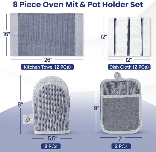 Casa Platino Mini Oven Mitts Set, 8-Piece – 500°F Heat Resistant Silicone Oven Mitts, Potholders for Kitchens, 2 Kitchen Towels & 2 Dish Cloths – Non-Slip & Durable – Indigo