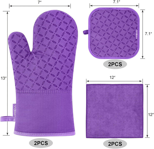 KEGOUU Oven Mitts and Pot Holders 6pcs Set, Kitchen Oven Glove High Heat Resistant 500 Degree Extra Long Oven Mitts and Potholder with Non-Slip Silicone Surface for Cooking (Purple)
