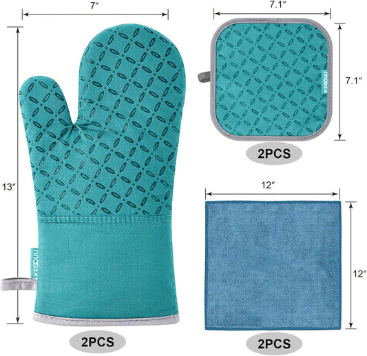 KEGOUU Oven Mitts and Pot Holders 6pcs Set, Kitchen Oven Glove High Heat Resistant 500 Degree Extra Long Oven Mitts and Potholder with Non-Slip Silicone Surface for Cooking (Deep Green)