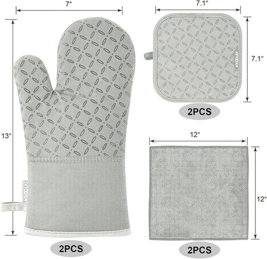 KEGOUU Oven Mitts and Pot Holders 6pcs Set, Kitchen Oven Glove High Heat Resistant 500 Degree Extra Long Oven Mitts and Potholder with Non-Slip Silicone Surface for Cooking (Grey)