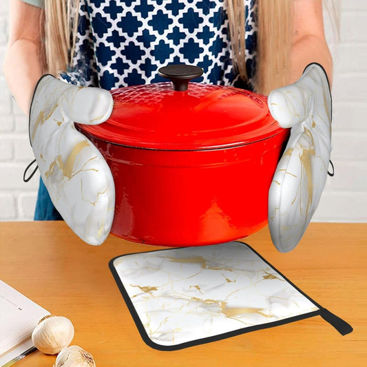 White Gold Marble Oven Mitts and Pot Holders Sets of 3 Heat Resistant Oven Gloves Hot Pads Non-Slip Kitchen Accessories for Baking Cooking Grilling BBQ