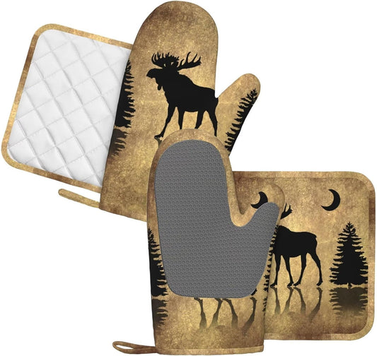 Rustic Elk Moose Deer Forest Pine Tree Moon Design Oven Mitts and Pot Holders Sets Silicone Moose Kitchen Mitts Potholders Heat Resistant 4Pcs Moose Oven Gloves Hot Pads for Kitchen