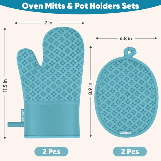 Oven Mitts and Pot Holders 4 Sets, Heat Resistant 500 ℉ Oven Mitt and Pot Holder,Oven Glove&Potholders with Non-Slip Silicone Surface,Kitchen Essentials for Cooking/Baking/BBQ-Lake Blue