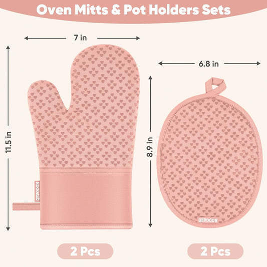 Oven Mitts and Pot Holders 4 Sets, Heat Resistant 500 ℉ Oven Mitt and Pot Holder,Oven Glove&Potholders with Non-Slip Silicone Surface,Kitchen Essentials for Cooking/Baking/BBQ-Pink