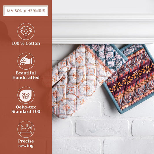 Maison d' Hermine 100% Cotton Oven Mitt & Pot Holder Set (7.5"x13" & 8"x8") Heat Resistant BBQ Cooking Gloves with Loop, Baking, Grilling, Kitchen, Handling Hot Pans (Nila)
